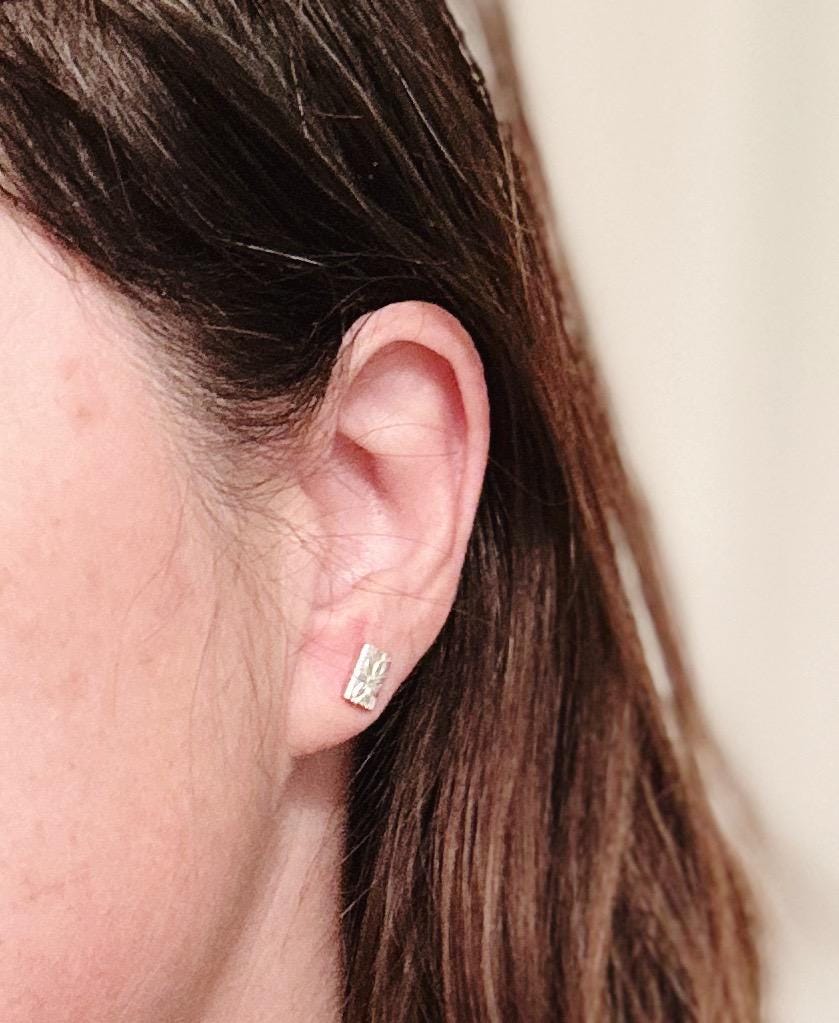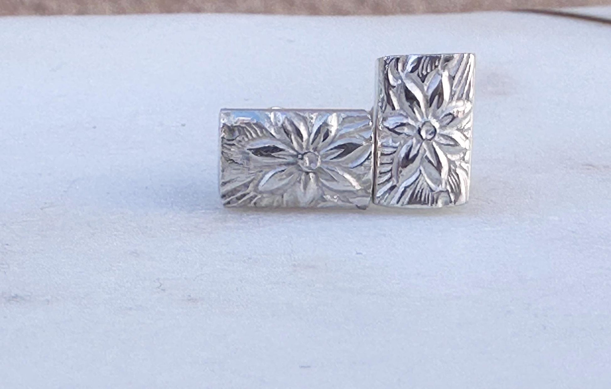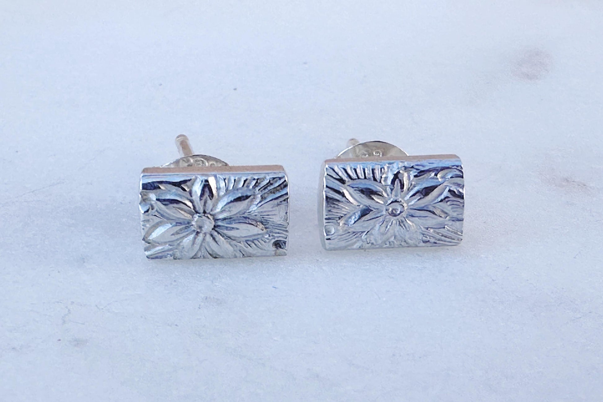 This dainty sterling silver floral bar stud earrings are a great addition to every outfit. These studs are made of pattern wire. I hand fabricated this pair of earrings from wire, I hand saw the earrings and then sand them down. Then, I soldered the sterling silver ear posts to the earrings with hard solder. It is lead—and nickel-free. Since this is handmade it is organic and not perfect. All my jewelry is made here in the USA. They measure 1/4 inches long and 1/4 width. Once payment is received, I will ship it in a gift box and ribbon in a sturdy mailer.